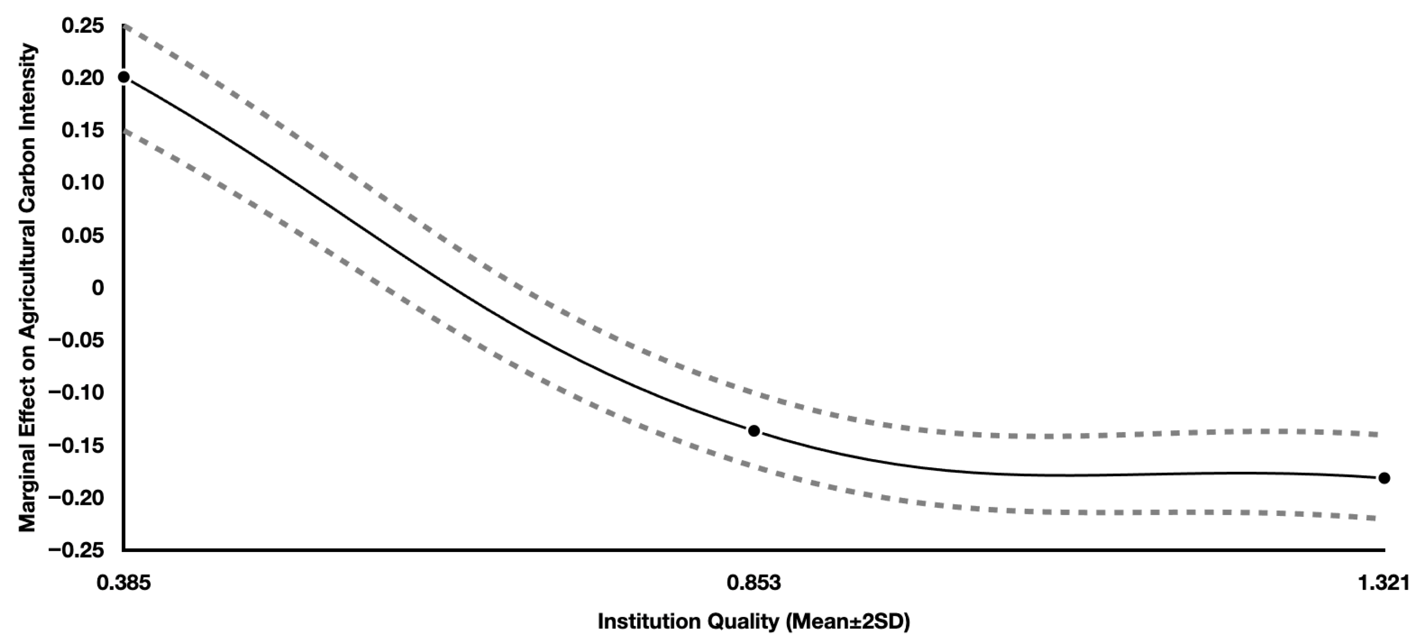 3.2.3. The Regulatory Effect of Institutional Quality on Agricultural Carbon Emissions