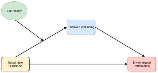 Together, these frameworks provide a basis for examining how sustainable leadership and eco-anxiety interact to influence the well-being of the employees and, in turn, environmental performance. Therefore, the conceptual model (Figure 1) illustrates the direct relationship between SL and organizational performance, the mediating effect of psychological well-being, and the interaction effect of Eco-anxiety.