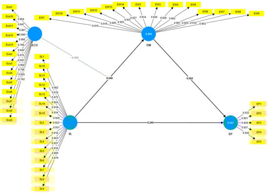 The outer model is being analyzed using SmartPLS4. The model demonstrates hypothesized relations concerning SL and environmental performance, whilst highlighting the mediation effect of employees’ well-being and the moderating impact of eco-anxiety between SL and EW (see Figure 2).