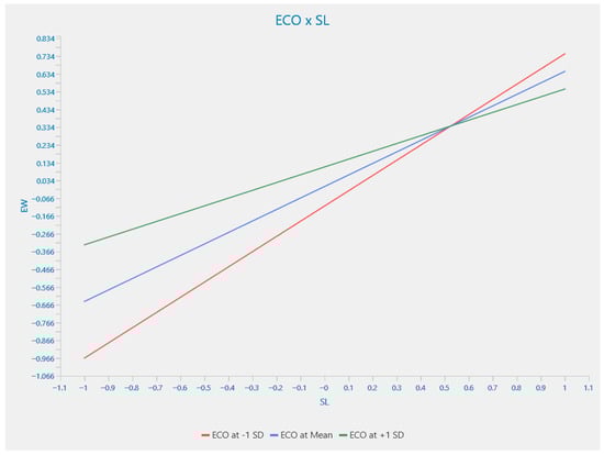 Table 5 posited that eco-anxiety weakens the positive links between sustainable leadership and employees’ well-being (H3). The interaction term is negative and significant (β = −0.209, t = 3.449, p = 0.001). It confirms that higher levels of eco-anxiety dampen the beneficial effect of sustainable leadership on employee well-being. Practically, when eco-anxiety is elevated, the capacity of leadership to boost well-being is reduced considerably.