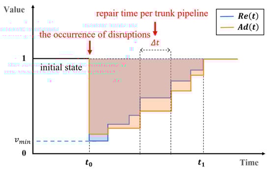 Considering that long-distance trunk pipelines are generally composed of multiple pipe sections with varying characteristic parameters and laying environments, the performance curve following disruptions is shown in Figure 3. It is assumed that the damage propagation from disruptions to the pipeline occurs instantaneously, and the repair rate for any given pipe section is linear by default. The green shadow area within the time span of the assessment () are calculated to measure the resilience performance.