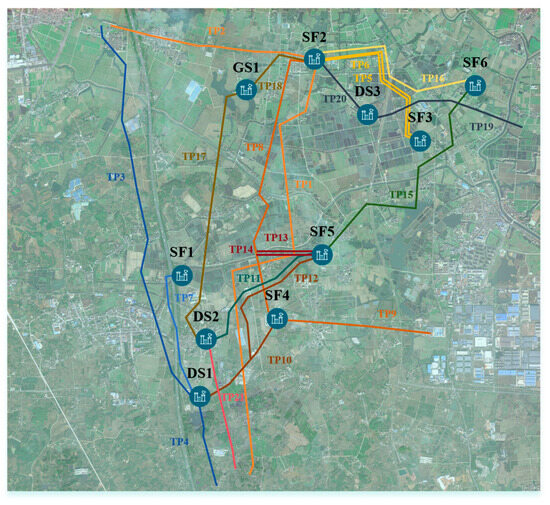 A cross-regional long-distance pipeline transmission network within a representative municipal-level administrative region in China is selected as a case for empirical analysis. The selected midstream section of the network manifests typical hub characteristics and a sophisticated topological structure, comprising 21 long-distance trunk pipelines with a total length of 61 km and 10 critical stations along with associated storage facilities, collectively forming a multi-source, multi-path transmission and distribution network system. It is noteworthy that major arteries of the national trunk natural gas pipelines, notably including the West–East Gas Pipeline and the Sichuan-East Gas Transmission Project, traverse this region. This configuration positions the case system not only as a local transmission and distribution network but also as a critical node within the national strategic energy corridor. These characteristics render it an ideal case for investigating the resilience performance of a regional-level pipeline network. The basic information of the stations and storage facilities included in this case is provided in Table 5. The data for the long-distance trunk pipelines included in this case is provided in Table 6. The spatial distribution of the trunk pipelines, stations, and storage facilities included in this case analysis is illustrated in Figure 7. The topological relationships among the stations, storage facilities, and long-distance trunk pipelines within the assessment boundary are depicted in Figure 8.