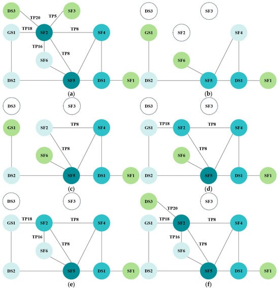 Unlike pipeline resilience assessment, which focuses on the integrity retention rate of physical components under disruptions, the network resilience assessment conducted in this research primarily quantifies and analyzes the system’s adaptive capacity and recovery capability under different restoration strategies from the perspectives of network topology and functionality. As described in Section 3.2, the affected area in this case study focuses on the local transmission network formed by storage facility SF2 and its eight directly connected trunk pipelines. To accurately represent the topological structure and functional logic of this system, the redundant pipelines TP5 and TP6, which are laid in the same trench, were reasonably simplified and merged into a single pipeline TP5 in the model. Additionally, pipelines whose other connected node falls outside the local network are not included (TP1 and TP2). Furthermore, the case analysis clearly defines the system boundary (SF2, TP5, TP8, TP16, TP18 and TP20), focusing only on the structure and internal functionality of this local network, while excluding interactions with external systems. The topological connections of this study network under normal operating conditions are illustrated in Figure 10a. To evaluate the impact of different restoration strategies on system recovery capacity, two distinct restoration strategies are formulated based on the quantified pipeline failure length and recovery indices analyzed in Section 3.2.