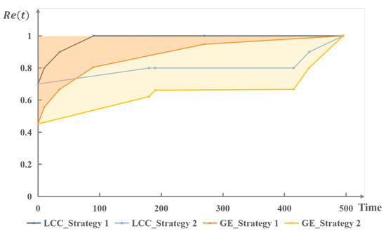 Through calculating the temporal evolution of LCC and GE under the two restoration strategies, the dynamic performance and adaptive capacity of the system during the post-disruption recovery phase is quantitatively evaluated. The performance evolution curves are shown in Figure 12. The orange and yellow shaded areas illustrate the performance loss and recovery of the global efficiency of the topology network under the two respective restoration strategies. Simulation results demonstrate that, under the assumed disruption scenario and resource constraints, the time-priority strategy guides the system toward performance recovery more effectively. Compared to the node-degree-priority strategy, the time-first approach maintains a larger connected sub-network and higher transmission efficiency at most time points, indicating its superior adaptive capacity and recovery effectiveness in this specific context.