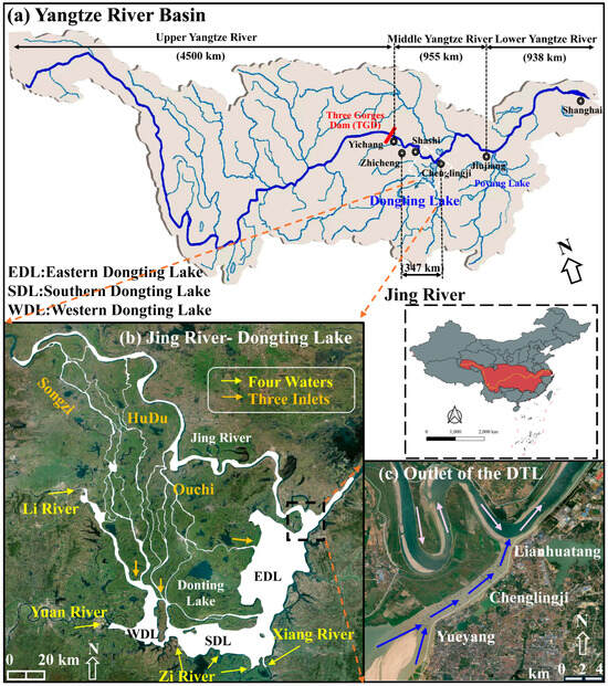 Overview of the study area. (a) Yangtze River Basin; (b) Satellite image of the Jing River-DTL water system structure, where Four waters and Three inlets are shown; (c) Satellite image of the connection region from DTL to Jing River.