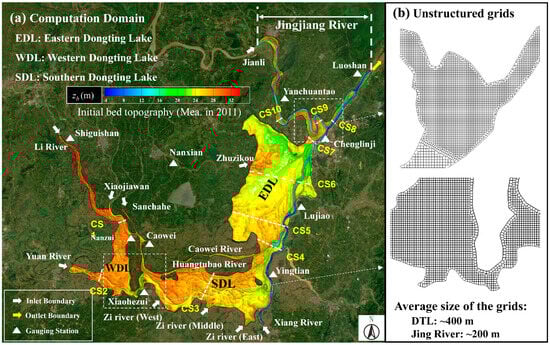 However, the lack of long-term high-resolution data hinders a comprehensive understanding of how changes in sediment transport and morphological evolution have reconfigured the river–lake relationship between the Jing River and DTL. In Recent decades, numerical modeling has become the principal tool for quantifying these coupled processes [19,20,21]. Two-dimensional (2-D) hydrodynamic frameworks (e.g., MIKE21) are routinely applied to simulate flow fields and water quality across river-lake reaches [21,22]. Recent studies have demonstrated that coupled 1-D/2-D models can reproduce the water-level dynamics of the DTL area under both historical and engineered conditions, including the operation of the TGR [23,24,25]. Nevertheless, most existing investigations focus solely on hydrodynamics, while the feedback between flow and bed morphology remains underexplored. Morphodynamic coupling is essential for capturing the evolution of channel geometry and its impact on river-lake interaction, as highlighted by recent analyses of riverbed adjustment in the Jing River–DTL system [26].
