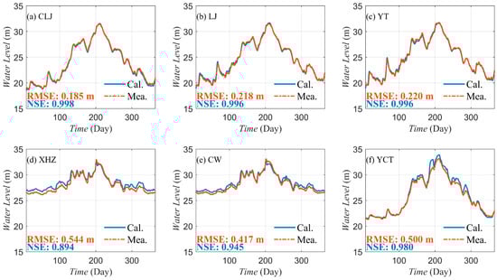 where n represents the number of time series data points; and denote the simulated and observed values, respectively; and indicates the mean value of the observed variable. The NSE ranges from 0 to 1, where 1 indicates perfect agreement between simulated and observed values, and 0 reflects complete disagreement. Figure 3 presents a comparison between calculated and observed water levels for Case 3 at six representative stations (CLJ, LJ, YT, XHZ, CW, and YCT). The simulated and observed water levels, which range approximately between 20 and 30 m at the selected stations, are consistent with the local gauge datums in 2012. At the majority of stations, the simulated values closely reproduce the observed trends, with NSE coefficients of 0.998, 0.996, 0.996, 0.894, 0.945, and 0.980, respectively. Additionally, the values of RMSE for the stations are as follows: CLJ = 0.185 m, LJ = 0.218 m, YT = 0.220 m, XHZ = 0.544 m, CW = 0.417 m, and YCT = 0.500 m. These NSE and RMSE values indicate the precision of the model in reproducing observed water levels, with smaller RMSE indicating better model performance. The relatively lower NSE and Higher RMSE at XHZ, corresponding to an approximate 10% error, can be attributed to local hydrological complexities. In particular, water levels at XHZ are heavily affected by inflows from the Songzi River. Discrepancies at this station arise because the model did not incorporate the complex river network of the Three Inlets channels, or inputs from smaller tributaries. Nevertheless, the simulation results are satisfactory, especially as the simulated and observed values along the YT–LJ–QLS transect in the EDL exhibit near-perfect agreement, demonstrating the model’s reliability.