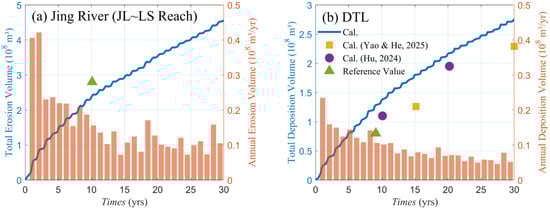 As shown in Figure 4a, the Jing River reach exhibits persistent erosion along the main channel. The total erosion in the Jianli–Luoshan segment is simulated to reach 240 million m3 by the 10th year, which is comparable to the reference value of 280 million m3 reported in 2021, representing a deviation of about 14.3%. Over the full 30-year period, cumulative erosion is projected to reach 462 million m3. The annual erosion rate exhibits a pronounced decreasing trend, declining from approximately 20 million m3/yr to about 10 million m3/yr by the end of the simulation. For the DTL region (Figure 4b), the predicted deposition volumes in this study are consistently higher than estimates from previous studies. Over 10 and 20 years, the model predicts sediment deposition of 136 million m3 and 215 million m3, respectively, with a deviation of 10.2% at the 20th year compared to earlier estimates conducted by Hu [36], in which predicted cumulative deposition of 110 million m3 and 195 million m3 at the 10th and 20th year. The 1-D model simulated cumulative deposition of 126 million m3 and 229 million m3 at the 15th and 30th year, respectively, whereas this study predicts 276 million m3 by the 30th year, representing a 17.0% deviation at the 30th year. Furthermore, when benchmarked against the reference deposition value of 80.35 million m3 for the DTL region, the model’s predicted sedimentation trend shows general alignment with the observed conditions.