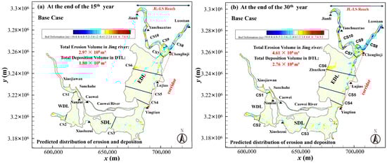 Predicted distribution of erosion and deposition in the computational domain by Base Case at (a) the 15th year and (b) the 30th year.