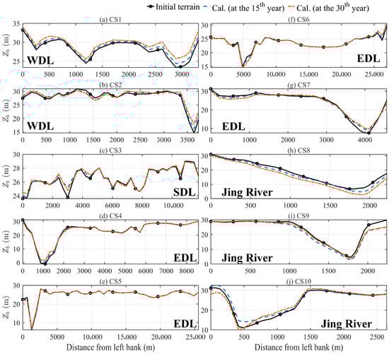 Furthermore, Figure 6 illustrates the changes in cross-sectional morphology after 15 and 30 years (section locations are shown in Figure 2). At Section CS1 (near Xiaojiawan and Sanchahe), both the channel and floodplain exhibit significant deposition, with a maximum sediment thickness of nearly 4 m. As for Sections CS2 and CS3, located in the West, South, and EDL areas, are characterized by deposition in the deep channels, while the floodplains display alternating erosion and deposition, albeit with smaller magnitudes than those in the deep channels. Sections CS4, CS5 and CS6 in EDL display channel erosion alongside floodplain deposition. Overall, the lake area exhibits a deposition-dominated trend. At Section CS7 within the outflow channel, sediment accumulation occurs due to mainstream incision, consistent with previous findings. Sections CS8 to CS10 along the mainstream are predominantly erosional, with notable channel downcutting. Among these, Section CS10—situated at a bend—shows initial deposition followed by erosion, highlighting the ongoing and complex adjustment of erosion–deposition dynamics in the Lower Jing River reach.