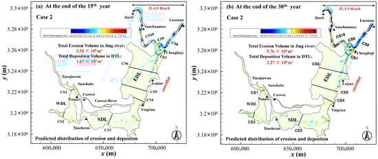 Predicted distribution of erosion and deposition in the computational domain by Case 2 at (a) the 15th year and (b) the 30th year.