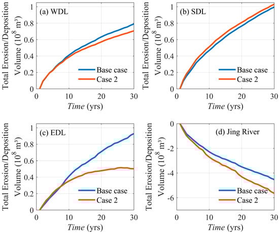 Predicted total deposition/erosion volume results in the Jing River-DTL system by Base Case and Case 2: (a) WDL; (b) SDL; (c) EDL; (d) Jing River (JL~LS) (Negative values denote erosion; positive values denote deposition).