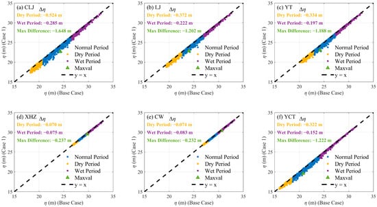 Comparison of water level calculations at typical stations with and without considering morphology evolution (Base Case and Case 1). Additionally, water level changes during the dry and wet periods, as well as the maximum differences, are provided in each subfigure.