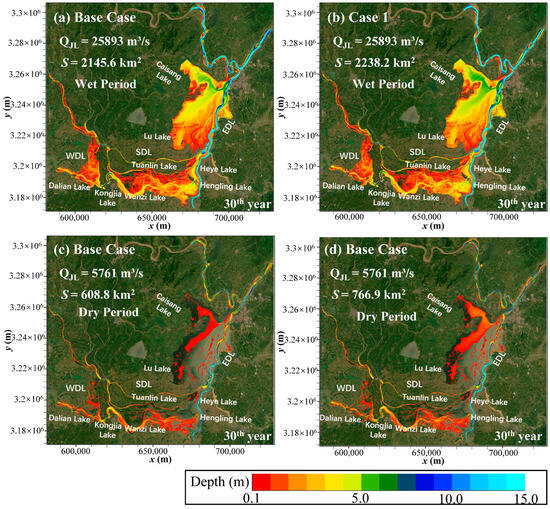 Predicted water depth distribution during flood and dry periods at the 30th year with and without morphology evolution (Base Case and Case 1). Additionally, discharge in JL (QJL) and wet surface area within the DTL basin (SDTL) at this moment are provided in each subfigure. (a) and (b) depict wet periods and that panels (c) and (d) depict dry periods.