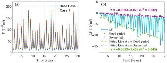 (a) Time variation in predicted water storage volume within the DTL in Base Case and Case 1; and (b) Time variation in the difference in the predicted water storage volume (Case 1 minus Base Case).