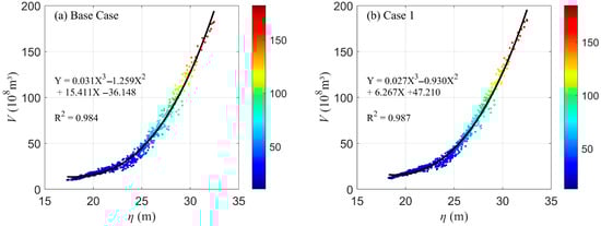 The relationship between the water storage volumes in the DTL and the water level at the CLJ station: (a) Base Case; (b) Case 1.