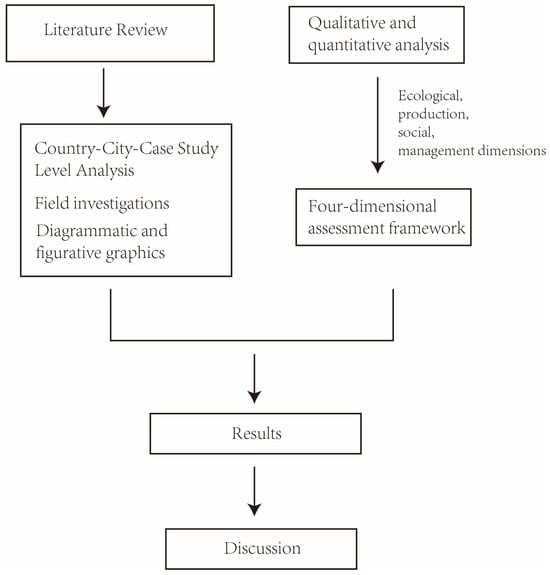 This study employs a combined approach of literature review and qualitative-quantitative analysis, exploring China’s urban agricultural landscapes through specific case studies. The two research methods are interrelated. The literature review method identifies the crises currently facing Chinese cities, the history of UA in China, and potential opportunities. It also details the background of the study areas and case studies, including the history and current status of UA in each region and the landscape spatial design of each case. Quantitative analysis examines the crises in China’s UA from ecological, productive, managerial, and social perspectives. Data quantification is used to evaluate the performance of the study samples across these dimensions, further exploring the current strengths and challenges of China’s UA. Figure 1 presents the research flowchart.