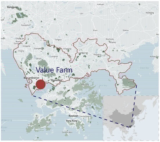 The Value Farm is situated in Shenzhen’s Shekou District. The project was developed on the reclaimed site of a former factory known as the Guangdong Glass Factory [58]. Covering 2100 m2, it was designed and established by Ole Bouman [58]. As a key exhibition piece for the Hong Kong-Shenzhen Bi-City Biennale of Urbanism Architecture 2013, it integrates urban vacant spaces and architecture, original industrial sites, and urban greening to create a regenerative landscape for the post-industrial era [58]. Figure 5 illustrates the geographical location of the case study. The project’s design philosophy draws inspiration from rooftop agriculture in densely populated cities and the transformation of original structures within historic urban centres [59]. At the same time, the basic form of the rooftop in the central Graham stress wet market which is 170 years old in Hong Kong made up the space of the project [59]. The initiative aims to rediscover nature within the urban fabric by integrating natural elements with Hong Kong’s historical context [59]. The project comprises three sections: cultivation zones, experiential areas, and exhibition spaces. These include rectangular planting beds of varying heights, a projection room, and a nursery. Brick walls, platforms, and open pavilions were designed within the existing stairwell area to enrich the site’s landscape [58]. Furthermore, irrigation ponds were installed alongside an irrigation system to enhance water resource utilisation.