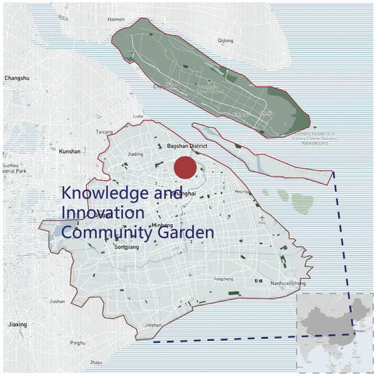 The Knowledge and Innovation Community Garden (KICG) is an urban agricultural community garden situated within the Knowledge and Innovation Community. Utilising interstitial urban spaces, it was established in 2016 and occupies an area of 2200 m2. In 2015, the Shanghai government promulgated the Implementation Measures for Urban Renewal in Shanghai. The area housing the Innovation Farm was designated for development within a key ecological axis. During the design phase, recognising the community’s lack of public and nature education spaces, the farm was assigned a public agricultural education function to enhance the community’s spatial capabilities. It stands as Shanghai’s first urban agricultural garden situated within an open block. Simultaneously, it serves as a demonstrative, educational, and social micro-urban agricultural garden. Figure 6 illustrates the geographical location of the case study. The KICG presents a narrow triangular layout. Centred within the farm is a communal activity pavilion, flanked by multifunctional cultivation zones including a facilities service area, public activity zone, permaculture area, community planting section, and one-metre vegetable plots. A winding path traverses all areas of the garden. The facilities service zone comprises a multi-purpose building, anaerobic kitchen waste composting bins, ecological flower beds, and rainwater collection tanks. The multi-purpose building, occupying approximately 100 m2, serves as the primary spatial hub designed to accommodate community public engagement activities. The public activity zone encompasses a 290-square-metre communal garden featuring an activity plaza and children’s play area. The permaculture area, spanning approximately 150 m2, primarily showcases sustainable cultivation design models. The public activity area covers 1531 m2, serving as the garden’s landscape focal point and aiming to enhance local plant genetic diversity. The one-metre vegetable plots comprise 40 wooden beds, each measuring one square metre. Functioning as allotments, it provides residents with practical opportunities for urban crop cultivation.