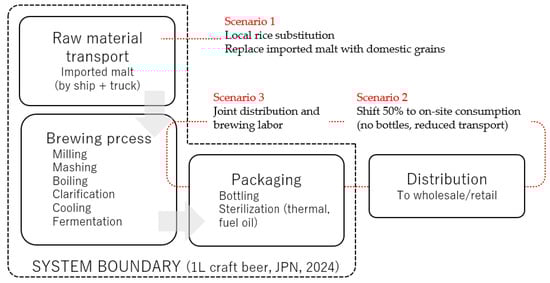 System boundary of craft beer production and scenario interventions (functional unit: 1 L of bottled beer at the brewery gate, Japan, 2024). The diagram illustrates the system boundary and three scenarios: Scenario 1 substitutes 30% of imported malt with domestic rice; Scenario 2 shifts 50% of sales to on-site draft to reduce packaging and pasteurization; Scenario 3 introduces shared logistics and partial labor reduction. Note: Agricultural cultivation is excluded from the main boundary. Scenario 1’s upstream effects are assessed separately in a supplementary sensitivity analysis.