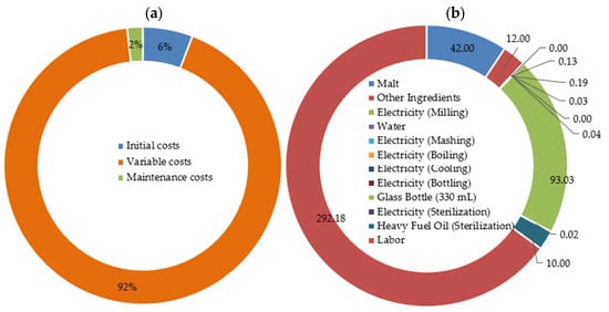 Breakdown of baseline life cycle cost (LCC) per 1 L of beer. (a) Overall cost structure by category, showing fixed (initial), variable, and maintenance costs as proportions of total cost, (b) Detailed breakdown of variable costs with absolute values (JPY), highlighting labor (JPY 292.18) and glass bottles (JPY 93.03) as dominant contributors. Zero-cost items are shown explicitly for completeness. Total cost is JPY 487 per liter. Charts are displayed side-by-side for comparative clarity.