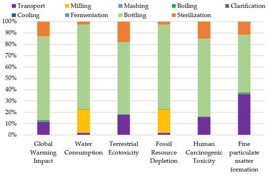 A 1 L volume of bottled craft beer emits 0.52 kg CO2e/L in the truncated cradle-to-gate scope (Figure 3). Packaging and thermal sterilization are the dominant contributors to global warming impact and several other midpoint categories. Glass bottle production and associated packaging account for the largest single share of global warming impact, fossil resource use, and toxicity-related indicators, while heat sterilization using heavy fuel oil is a major source of CO2 and air pollutant emissions. A step-by-step breakdown of all process-level emissions, including transport, brewing stages, packaging, and sterilization, is provided in Supplementary Table S7, which reports the contribution of each unit process to total global warming impact and all other midpoint indicators. Other brewing steps (milling, mashing, boiling, cooling, fermentation) contribute relatively little to total impacts.