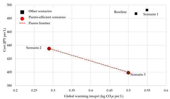 Scenario 3 (Joint logistics) maintains the same packaging and sterilization configuration as the baseline but reduces labor requirements and outbound transport intensity through cooperative brewing and shared logistics. The global warming impact slightly decreases to 0.50 kg CO2e/L, while cost falls to JPY 399/L (−18% relative to the baseline). Thus, the scenario delivers a substantial cost reduction with only a modest change in emissions, reflecting the limited impact of logistics and labor measures when packaging and energy use remain unchanged. This demonstrates that cooperative arrangements can meaningfully improve the economic viability of small breweries even if their environmental benefits are limited.
