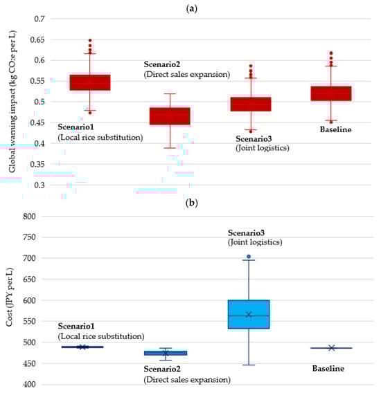To evaluate the robustness of the scenario comparison under parameter uncertainty, a Monte Carlo simulation with 1000 iterations was conducted. Uncertainty was propagated across both background LCI parameters—such as emission factors for materials, energy, and transport—and foreground assumptions, including labor costs, distribution ratios, ingredient sourcing, and production scale. Triangular distributions were used for cost and operational variables, lognormal distributions for emission-related parameters, and beta distributions for allocation ratios such as the direct sales share. A weak correlation between labor cost and production efficiency was modeled via a linked triangular scale adjustment. The resulting distributions for global warming impact and cost are visualized as boxplots in Figure 5, and summary statistics (mean, median, standard deviation, and 5th–95th percentiles) are reported in Supplementary Table S8.