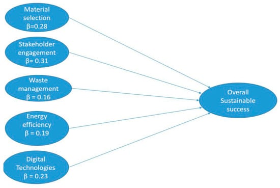 The structural model demonstrated acceptable fit, with SRMR = 0.061 (slightly above the ideal <0.05 but within accepted thresholds) and NFI = 0.92 (adequate). The five SSC drivers jointly explained 73% of the variance in Overall Sustainable Success (OSS). The measurement model was assessed for internal consistency, convergent validity, and discriminant validity. Composite reliability (CR) values ranged from 0.86 to 0.93, exceeding the 0.70 threshold, and average variance extracted (AVE) values were all above 0.50, confirming satisfactory convergent validity. In addition to traditional reliability and validity indicators, two contemporary diagnostic tests were applied to enhance methodological robustness. The Heterotrait–Monotrait (HTMT) ratio of correlations (Henseler et al., 2015) [35] was calculated to evaluate discriminant validity. All HTMT values were below 0.85, confirming adequate construct distinction. To address the potential for common method bias, the full collinearity variance inflation factor (VIF) approach (Kock, 2015) [36] was used, replacing the earlier Harman’s single-factor test. All VIF values were below 3.3, indicating no serious threat of common method variance. These updated diagnostic procedures align with current best practices in PLS-SEM research and strengthen the credibility of the measurement model results. Path coefficients are summarized in Table 4. Stakeholder engagement (β = 0.31, p < 0.001), material selection (β = 0.28, p < 0.001), and digital technologies (β = 0.23, p < 0.001) emerged as the strongest predictors of OSS. Energy efficiency (β = 0.19, p < 0.01) and waste management (β = 0.16, p < 0.01) also exerted significant positive effects, though with weaker magnitudes (Figure 2).