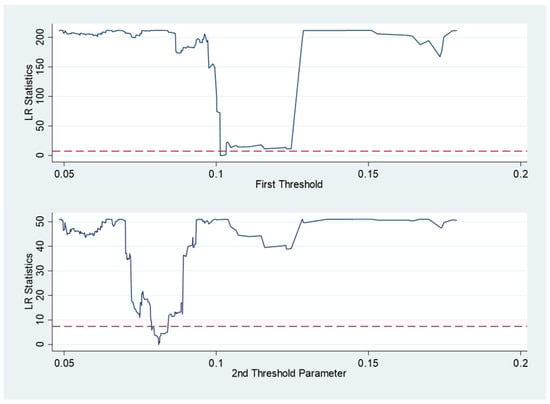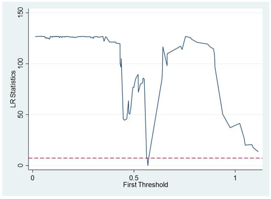 Column (1) of Table 9 displays the regression results when the degree of openness is taken as the threshold variable. When the degree of openness is lower than the threshold value of 0.5689, the regression coefficient of the digital economy on foreign trade resilience is 0.921, which is significantly positive at the 1% level. When the degree of openness exceeds the threshold value of 0.5689, the coefficient of the digital economy’s impact on foreign trade resilience is 0.566, which also passes the 1% significance test. Nevertheless, in comparison to the scenario where the degree of openness is below 0.5689, the regression coefficient has decreased notably (Figure 2). This indicates that the promotional effect of the digital economy on foreign trade resilience weakens as the degree of openness expands. Uncontrolled and blind expansion of openness will increase China’s dependence on foreign technologies, services, and products, which not only hinders the development of the country’s core pillar industries and advanced technologies but also elevates the risk of being affected by external economic and political volatility.