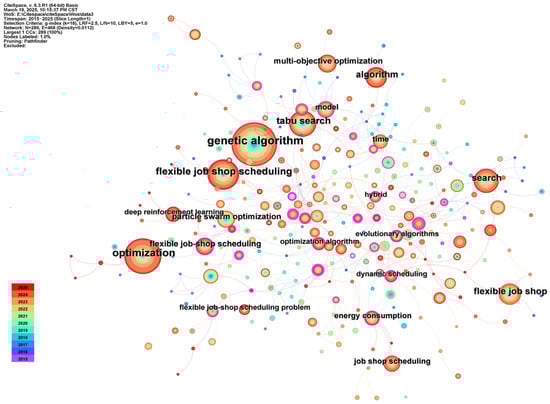 It is worth noting that the high frequency of “Energy consumption” highlights that energy efficiency and energy saving have become key considerations for scheduling optimization in the modern industrial context. In addition, “Algorithm”, as a generic but basic keyword, further emphasizes that the core of the research lies in the design, development and application of various algorithms.