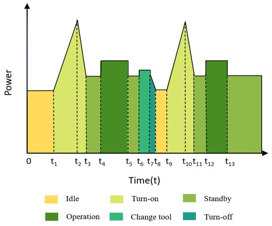 In the actual production workshop, the energy consumption generated during the job machining process is often very complex. The power of the machine tools varies at different stages, so the total energy consumption of the workshop is divided into five parts based on the five stages of the workshop, the machining energy consumption generated on each machine tool, which also involves the energy consumption generated when the machine tool is ready for machining, the energy consumption for the transportation of materials between the machines, the idle energy consumption of the machine tools when they are not machined, and the public energy consumption of the whole workshop. Figure 5 illustrates the energy consumption of the machine tools at different stages [66,67].