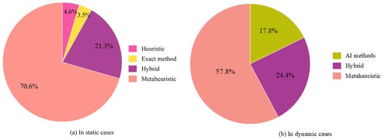 The research topic of this review is the EDFJSP. Therefore, we selected the literature by considering the broad category regarding energy consumption as a required scheduling objective. Common scheduling objectives in the reviewed papers include maximum completion time, energy consumption, maximum workload, lead/delay time, production cost, and customer satisfaction. As shown in Figure 4, since the topic of this paper is energy consumption, this means that energy consumption is used as an important screening objective for our review, and therefore, its frequency is the highest. Second is maximum completion time. Production costs and customer satisfaction have the lowest proportions, though “lowest” here refers only to their ranking in the chart. In fact, both production costs and customer satisfaction appeared three times each, while metrics like machine idle rate, workload deviation, and processing quality appeared only once or twice, hence being grouped under “Other.”