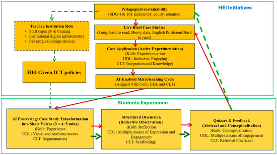 Integrated conceptual framework of AI-enabled microlearning for pedagogical sustainability. This model aligns the AI-enabled microlearning cycle with Kolb’s experiential learning theory, Universal Design for Learning (UDL), and Cognitive Load Theory (CLT), operationalised within institutional strategies for pedagogical sustainability (SDGs 4 and 10). Green arrows represent institutional-level enablers, red arrows represent pedagogical flow across the microlearning cycle, and dashed arrows indicate indirect or supporting relationships.