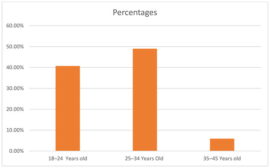 Two rounds of surveys were distributed across the 2023 and 2024 cohorts, combining Likert-scale items (1–5) measuring perceptions of accessibility, engagement, inclusivity, confidence, and stress with two open-ended questions to gather qualitative reflections. The qualitative dataset was further enriched through semi-structured interviews conducted with 10 students in 2023 and 8 students in 2024. An assistant researcher facilitated recruitment, obtained consent, and anonymised transcripts. Each interview lasted approximately 25–30 min and followed a flexible guide focusing on accessibility, engagement, and the perceived inclusivity of AI-enabled learning materials. To contextualise the sample, Figure 2 presents the gender distribution of participants, and Figure 3 displays the age composition across the 2023–2024 cohorts.