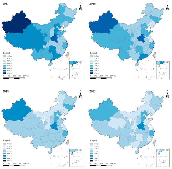 In addition, from a temporal perspective, the disease incidence rate in China shows a downward trend, but there are significant differences in dynamic changes across different regions. As can be seen from Figure 2, a heatmap was created using the residents’ health scores of each province for the years 2013, 2016, 2019, and 2022. Under the guidance of the ecological and environmental protection supervision policy, the disease incidence rate in the eastern regions with higher population density has shown a downward trend, while the disease incidence rate in the western regions with lower population density has significantly decreased.