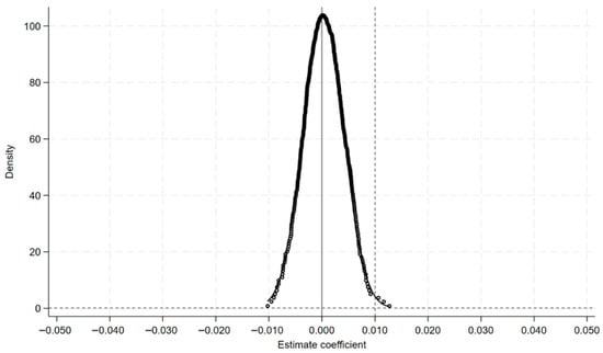 In quasi-natural experiment research, conducting a placebo test aims to eliminate the interference of other non-policy factors on the research results and ensure that the identified impact of the ecological and environmental protection supervision policy on residents’ health is causal rather than caused by unobservable confounding factors. By constructing false policy implementation times or false treatment groups [34], we test whether estimated results similar to the real policy effects appear in these false scenarios; if no significant effects emerge in the false scenarios, it indicates that the real policy effects are robust. Drawing on existing literature, this study generates dummy policy interaction terms by randomly selecting treatment and control groups, then adopts the baseline regression model and repeats the above operation 500 times to conduct the placebo test. From the distribution in the Figure 3, the estimated coefficients are mainly concentrated around 0 with a high density peak, which shows that in the placebo test, when a false policy shock is imposed, the estimated coefficients are mostly distributed around 0 without a significant deviation from 0. The dashed line represents the estimated coefficient values obtained from actual data processing. By comparing the relative positions of the dashed line and the solid line, it can be observed that the black dashed line lies in the extreme tail of the solid bell curve. The results in the Figure 3 indicate that no other factors or random disturbances can produce effects similar to those of the EEPS policy, thereby verifying that the impact of the EEPS policy on residents’ health is genuine and not caused by other confounding factors, which effectively enhances the robustness of the study’s causal inference.
