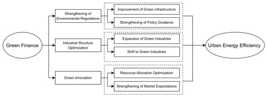 Mechanisms of green finance’s impact on urban energy efficiency. The dashed boxes indicate the specific sub-mechanisms for each pathway.