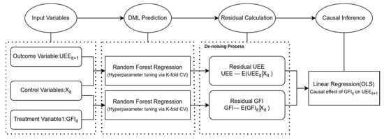 To rigorously investigate the impact of green finance on urban energy efficiency, this study adopts the Double Machine Learning (DML) framework. This approach offers significant advantages over conventional causal inference models, particularly in terms of variable selection and estimation accuracy [37]. Urban energy efficiency is a complex system influenced by a wide range of socioeconomic factors. DML is uniquely suited to this high-dimensional context, providing a more accurate assessment than traditional alternatives.