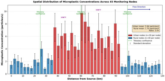 Figure 3 demonstrates pronounced spatial variability in microplastic concentrations, with elevated levels observed in urban tributary confluences and downstream of wastewater treatment facilities, validating the necessity for spatially explicit modeling approaches. Urban nodes exhibited mean concentrations 3.2 times higher than rural reaches (t-test, p < 0.001), indicating strong anthropogenic influence on pollution patterns. Error bars represent standard deviation from monthly sampling replicates (n = 18 per node).