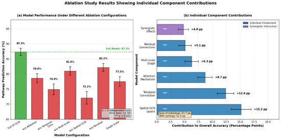 Experimental validation using 18 months of field observations from 45 monitoring nodes across a 127 km river reach demonstrated superior performance compared to conventional approaches. The ST-GCN model achieved 87.3% pathway prediction accuracy and a 16.8% mean absolute percentage error for concentration forecasting, representing substantial improvements of 23.5% and 51.6%, respectively, over traditional advection–diffusion numerical models. The backpropagation-based source tracing algorithm successfully identified pollution sources with 94.3% localization accuracy and a mean spatial error of 1.8 km, enabling rapid response within 4–8 h of pollution detection. Ablation studies confirmed that graph structure encoding, temporal convolution, and attention mechanisms contribute synergistically to overall performance, with the integrated architecture exceeding component-wise additive effects by approximately 4.8 percentage points.