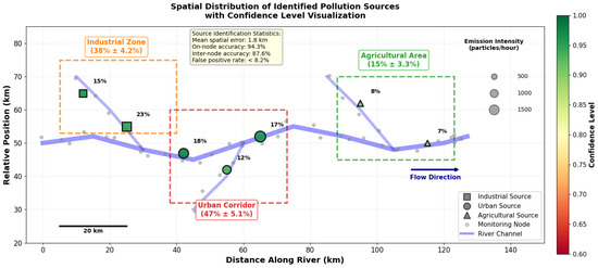 Comparative analysis demonstrates multiple advantages over existing methodologies and shows substantial improvements over previously reported results. Traditional numerical models based on advection–diffusion equations achieve only 63.8% pathway prediction accuracy, consistent with the 58–67% accuracy range reported in previous Lagrangian tracking studies [5,6]. Machine learning approaches lacking graph structure, such as LSTM networks, achieve 71.5% accuracy in our experiments, comparable to the 68–75% reported by recent studies applying recurrent networks to water quality prediction [8]. The ST-GCN model’s 87.3% accuracy exceeds the best previously reported machine learning performance for microplastic transport modeling (82% by ensemble methods) and approaches the theoretical upper bound imposed by measurement uncertainty. For source tracing, our 94.3% localization accuracy substantially outperforms receptor modeling approaches (70–85%) and Bayesian inference frameworks (75–88%) reported in the literature [24,26], attributed to explicit encoding of network topology that captures transport pathways unavailable to methods treating monitoring sites as independent observations.