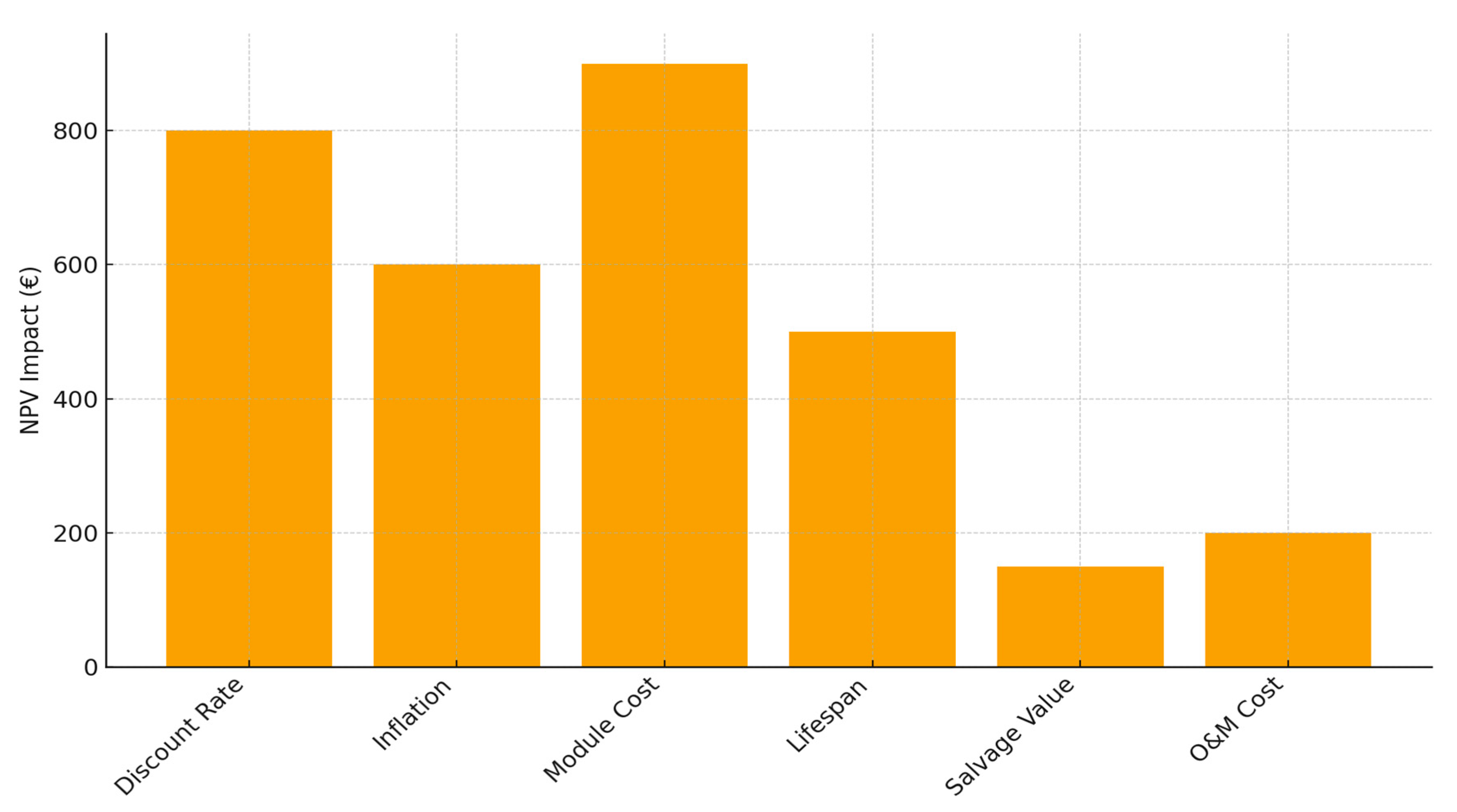 | Parameter | Variation Range | Low Case NPV (€) | Base Case NPV (€) | High Case NPV (€) | Impact Level |