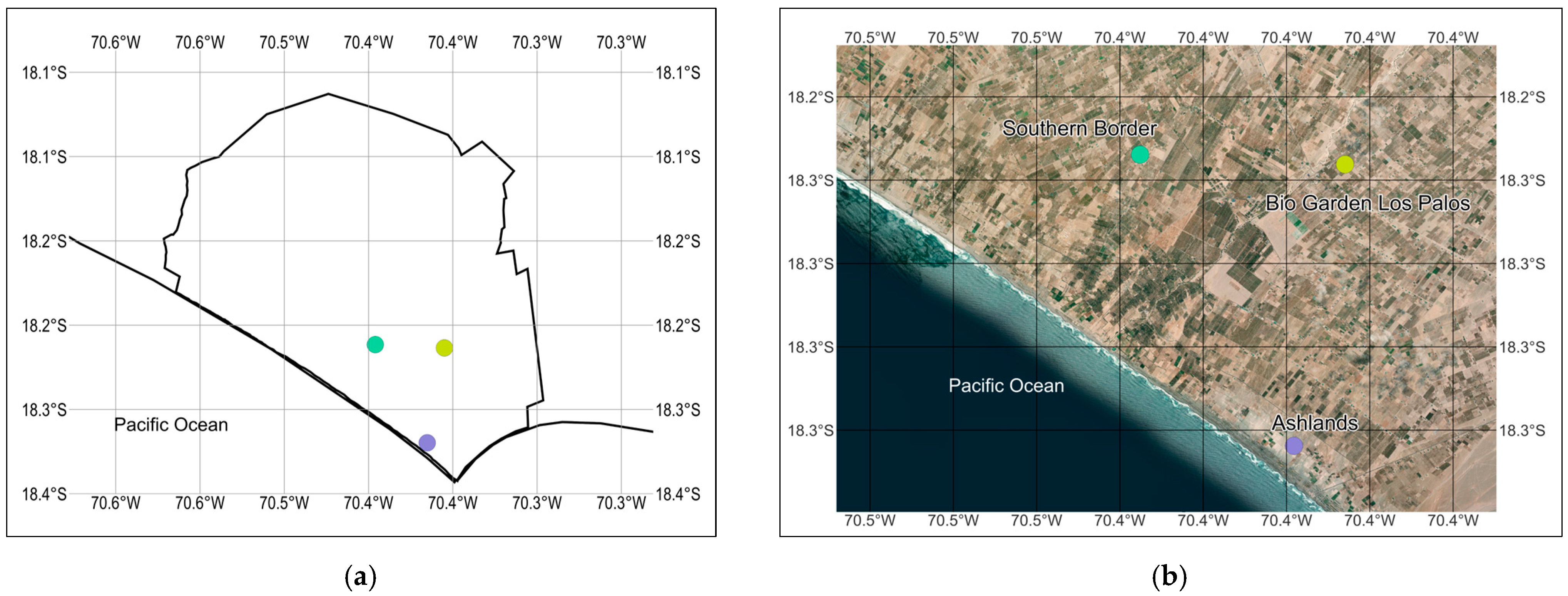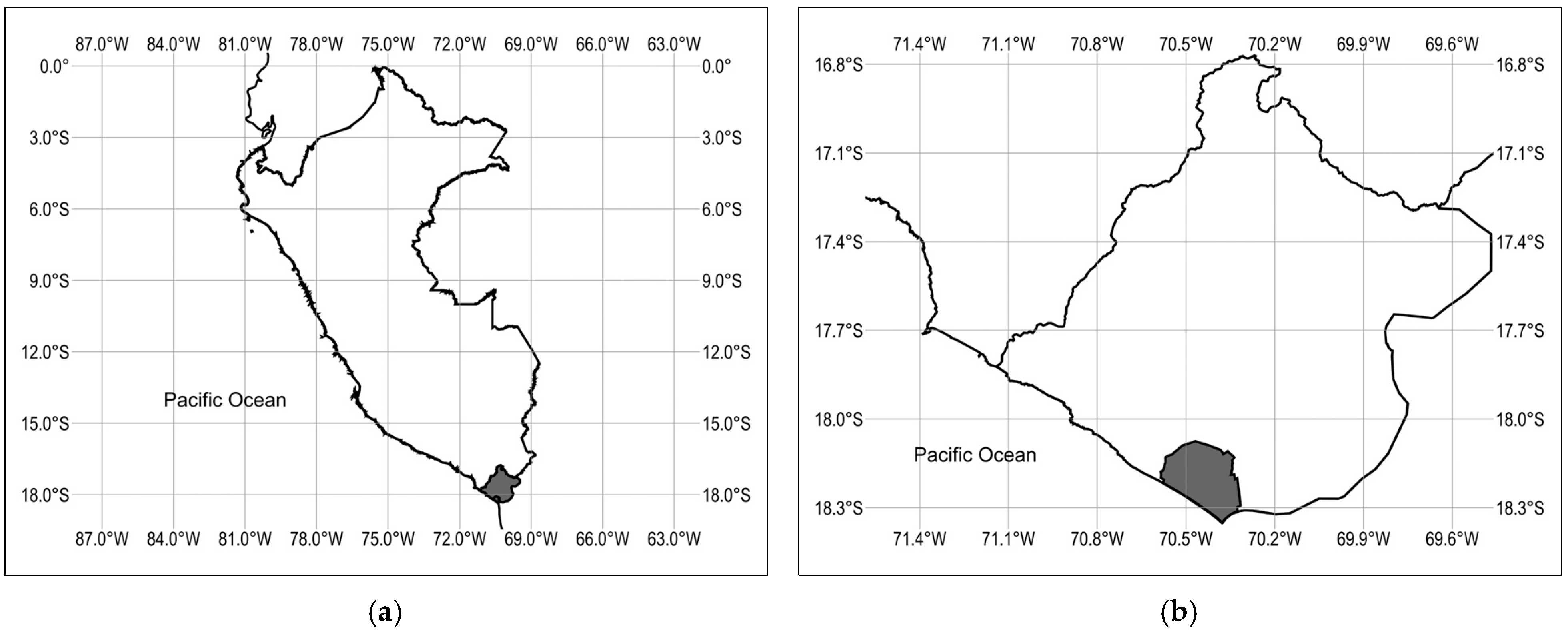- Autoridad Nacional del Agua; Consejo de Recursos Hídricos de la Cuenca Caplina–Locumba. Plan de Gestión de Recursos Hídricos de la Cuenca Caplina–Locumba, Actualizado al 2023; Autoridad Nacional del Agua: Lima, Peru, 2023; Available online: https://repositorio.ana.gob.pe/handle/20.500.12543/5652 (accessed on 15 October 2025).