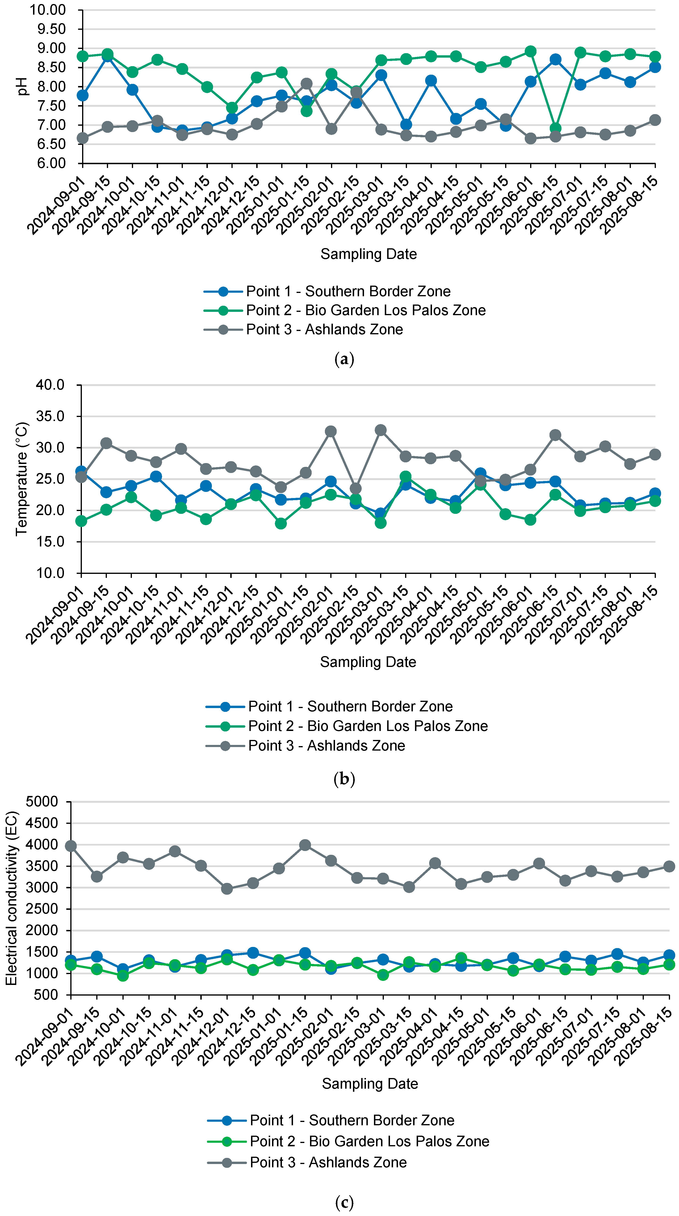 - : As (µg/L); : EC, TDS, pH, or temperature (evaluated at each point);