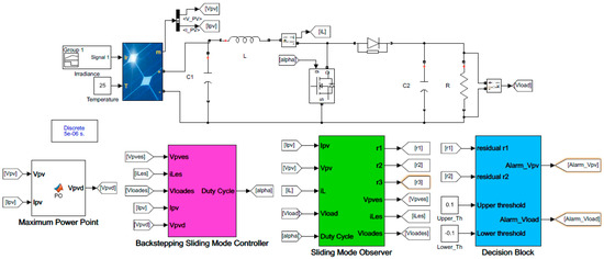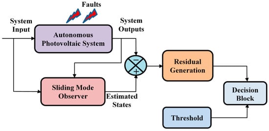 Figure 2 shows the overall diagram of the developed diagnostic approach. This method is based on the use of a sliding mode observer to generate the residuals. This observer allows for the estimation of the predicted state values using the same input (backstepping sliding mode controller) as the actual PV system. Subsequently, the residuals are generated between the nominal state values and the values estimated by the sliding mode observer. The residuals are then evaluated against threshold values. A fault is considered to occur when the generated residual exceeds the threshold values.