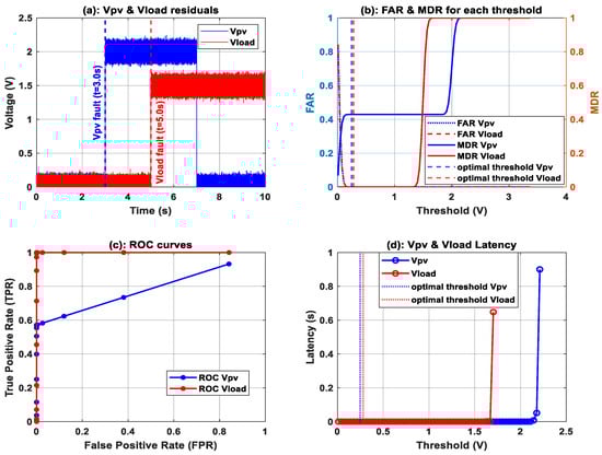 The simulation results offer a thorough evaluation of the sliding mode observer-based fault detection system for photovoltaic application. Figure 3a illustrates the residual amplitudes for both PV voltage (vPV) and load voltage (vload), distinctly showing spikes at the intentional fault injection times (3 s and 5 s, respectively). These residual signals exhibit excellent sensitivity to faults while maintaining stability during normal operation, with noise levels remaining below 0.2 V in fault-free conditions. Figure 3b shows the classic trade-off between FAR and MDR as the threshold varies. At low thresholds, FAR exceeds 50%, indicating excessive false alarms. At high thresholds, MDR surpasses 70%, rendering the system insensitive to faults. The optimal thresholds (0.247 V for vPV and 0.281 V for vload) strike a balance, achieving FAR < 3% and MDR < 2%. Figure 3c presents the Receiver Operating Characteristic (ROC) curve, a fundamental tool for evaluating the diagnostic capability of the fault detection system. This curve visualizes the trade-off between True Positive Rate (TPR) and False Positive Rate (FPR). This figure demonstrates the exceptional diagnostic capability of the proposed SMO, with an Area Under the Curve (AUC) of 0.78 and 0.98 for vPV and vload, respectively. The curve’s proximity to the top-left corner indicates near-perfect discrimination between normal and faulty operation. Figure 3d presents the latency characteristics of the fault detection system, showing the time delay between fault occurrence and detection across different threshold values. This is crucial for evaluating the real-time performance of the diagnostic approach. The latency analysis exhibits our system’s real-time capability, with detection delays below 3 ms for the optimal thresholds. The exponential increase in latency beyond 2 V thresholds confirms the necessity of our threshold optimization approach.