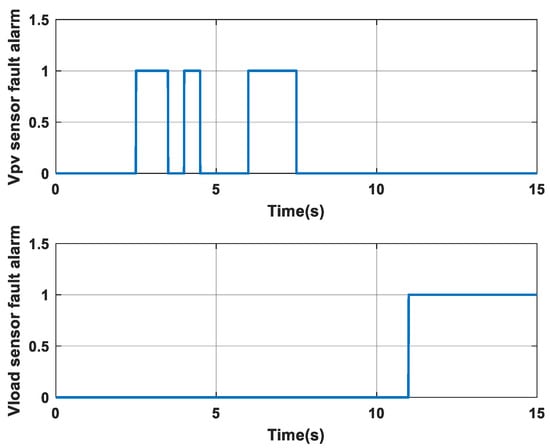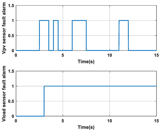 This part presents the simulation results related to the application of the diagnostic scheme considering independent sensor faults. Indeed, an intermittent fault fvPV and an abrupt fault fvload have been introduced on the output voltage of the photovoltaic module vPV and on the voltage across the load vload, respectively. Equations (23) and (24) illustrate the expressions of fvPV and fvload.