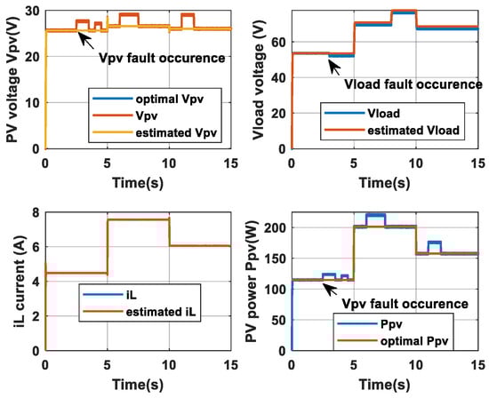 The simulation results are illustrated in Figure 5, Figure 6, Figure 7 and Figure 8. Figure 5 depicts the graphical representations of the three state variables of the system (vPV, vload, and iL), as well as their estimates obtained from the sliding mode observer. These results demonstrate the effectiveness of the proposed method for estimating the states of the system despite the presence of fluctuations in environmental conditions, system parameter variations, and sensor faults. Furthermore, this figure shows the evolution of the power pPV generated by the solar panel and the optimal power. It can be inferred that the backstepping sliding mode controller allows the extraction and tracking of the maximum power point for each level of sunlight. On the other hand, the generated power is sensitive to the sensor fault of the voltage vPV.