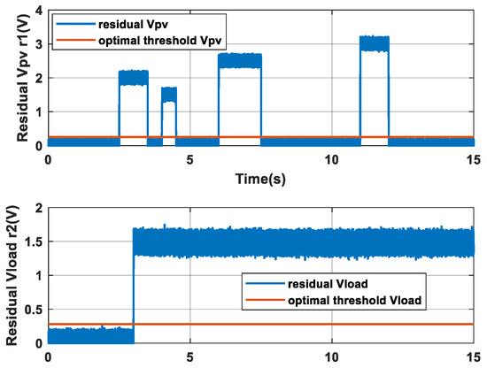This part illustrates the performance of the proposed diagnostic approach in the case where faults occur simultaneously. In fact, two additive faults were applied to the first vPV sensor and the second vload sensor according to the two Equations (25) and (26).